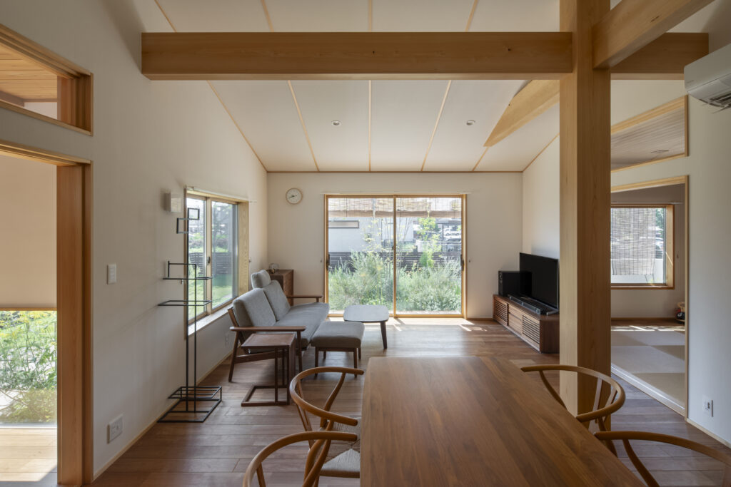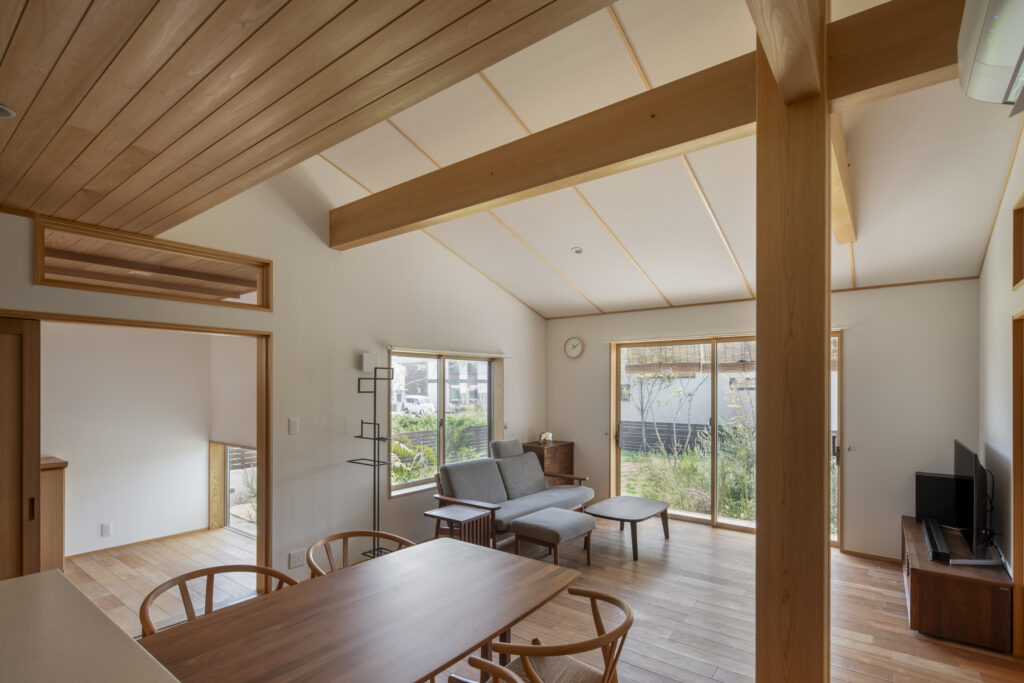 木質感を活かしながら、明るくて気持ちのいい空間に仕上がりました。コンパクトにまとめられたワンルームのようなLDK空間です。ただ、コンパクトとはいうものの間口を広めにとっているので、結構ゆったりとした雰囲気に仕上がっています。ナチュラルな緑の植栽に囲まれており、お庭と一体となったリビングはやはり気持ちいいですね。少し曲面になった天井も特徴的です。ちょっとしたことですが効果は高く、このおかげでよりやさしい雰囲気の空間になりました。デザインとして天井に付けた桧の細いボーダーラインも、細さ加減やピッチの塩梅がうまくいき、上品な雰囲気に寄与していると思います。あとは、得意とする大黒柱や太い梁といった見せる構造材も、効果的な位置を探って、いつもよりシンプルで現代的なデザインになるように設計しました。デザインを邪魔せず、なおかつ力強く存在感のある使い方ができて満足しています。